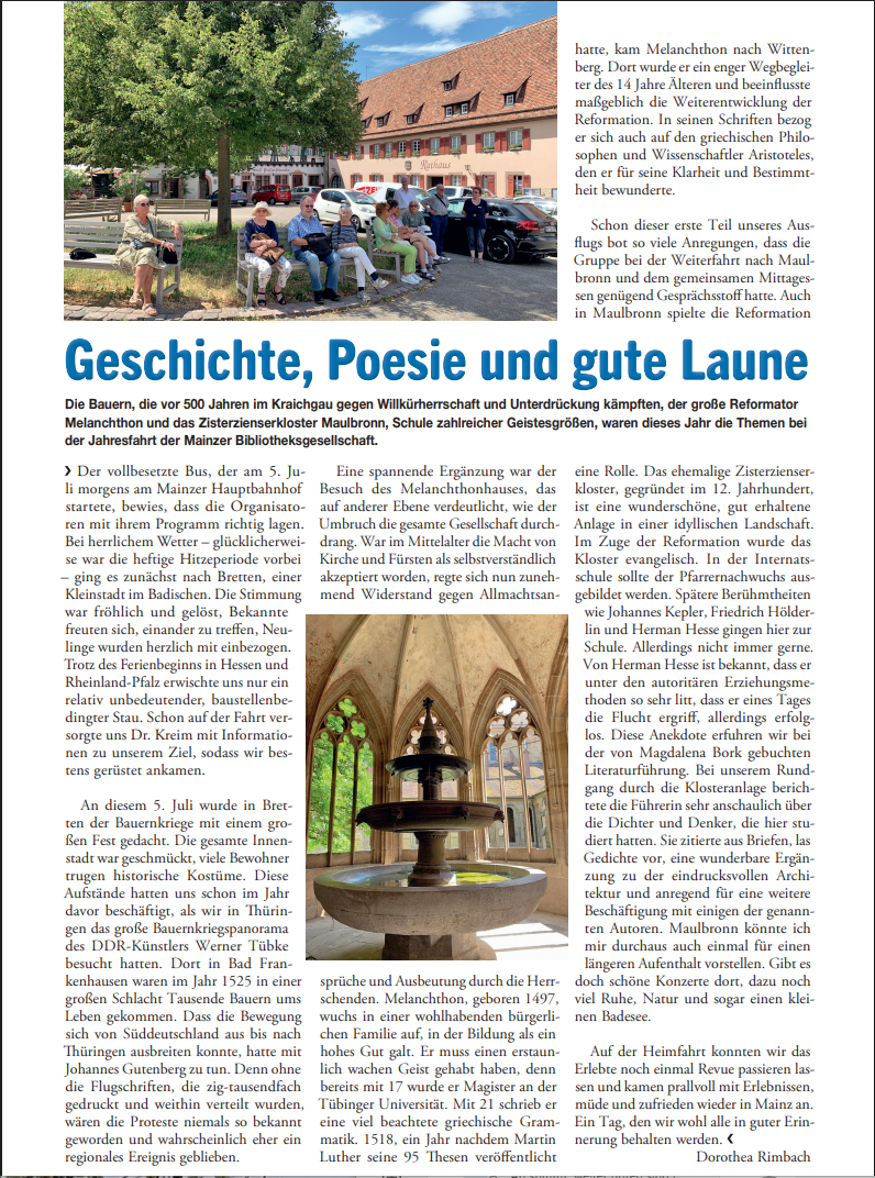 Unter dem Titel "Geschichte, Poesie und gute Laune" erzählt unser Mitglied Dorothea Rimbach von unserer Exkursion im Juli 2025. Lesen Sie selbst! (conSens 03-2025, Seite 36)